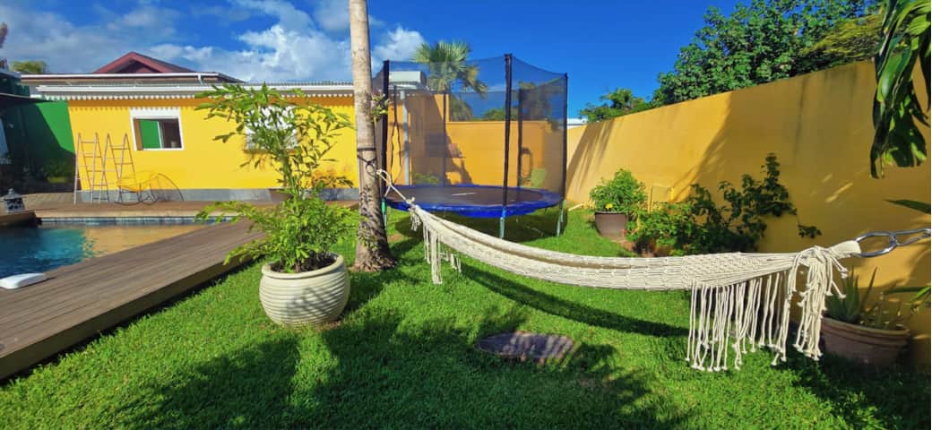 Équipements enfants : trampoline*, baby-foot*, console de jeux, grand jardin clôturé*.